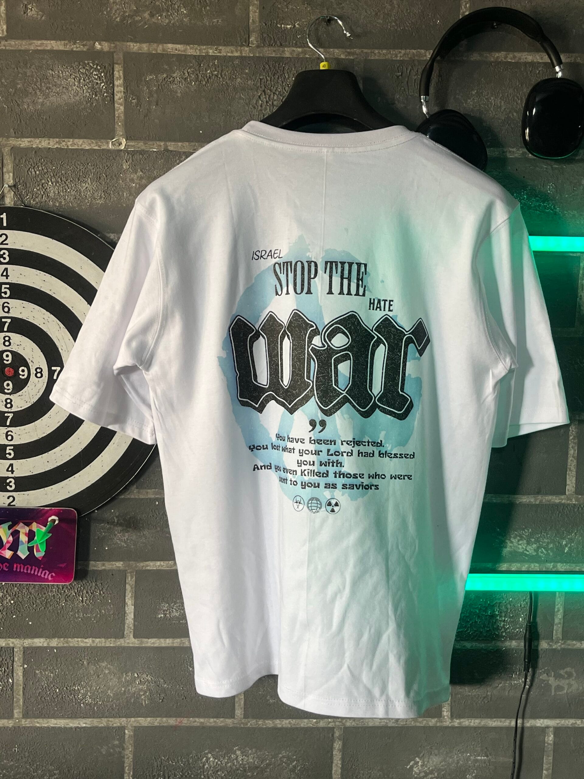 This graphic tee isn’t just clothing — it’s a statement piece. The bold typography and artistic design represent a powerful message against hate and war while keeping your streetwear game strong.